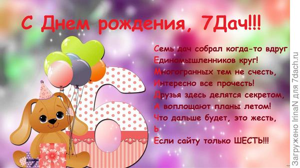 Поздравляю сайт 7 дач с Днем рождения! Желаю долголетия, процветания, новых идей и активных пользователей! Я на сайте почти 3 года, редкий случай, когда я не заглядываю на просторы Семидачья, и даже когда ничего не пишу — я читаю вас каждый день! Еще раз поздравляю всех, кто приложил руку к созданию сайта, всех верных админов и редакцию! Спасибо вам за все!