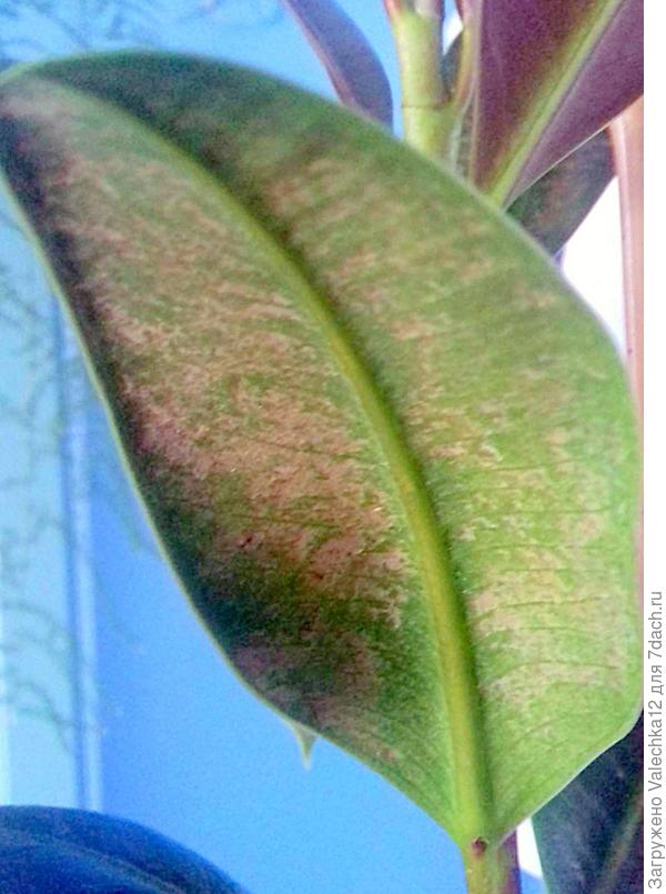 Приобрела фикус в магазине месяц назад, недавно обнаружила такие пятна с обратной стороны листа. Подскажите, пожалуйста, что это за вредитель и как с ним бороться?