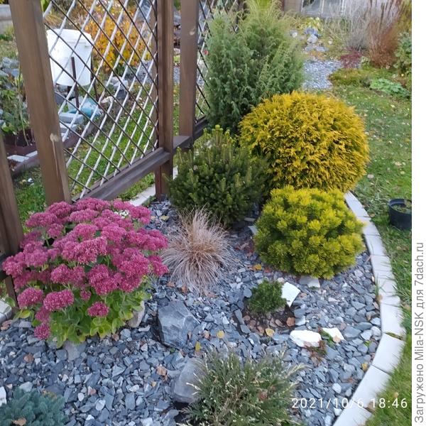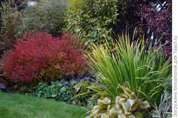 Спирею вроде бы я разглядела, а вот дёрен Вариегатный… не опознала, может быть на 6 фотке?- маленький багряный кустик среди хвойных веток?