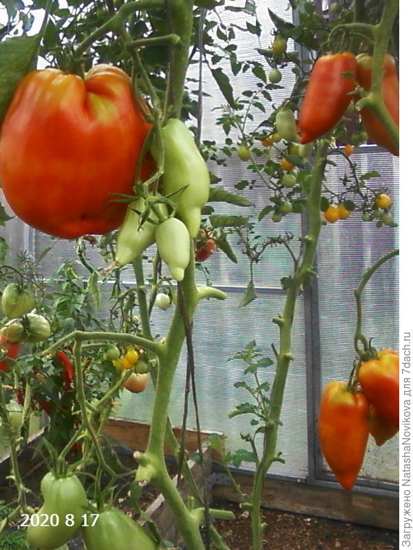 Этот год, ни смотря ни на что, могу смело назвать томатным. Самые -самые любимчики остались прежние — Японский краб и Орлиное сердце ( его двойник «Любимый праздник» тоже хорош). Понравился в этом году «Андреевский сюрприз» ( индет, вкусный, сладкий, урожайный), гибрид «Рафинад» ( урожайный, сладкий, индет), Чёрное сердце Бреда ( Очень вкусные, шоколадные, среднепоздние, индет). В открытом грунте — фавориты вся серия Непас ( с носиком, полосатые, морковные ( самые ранние в грунте). все очень урожайные, стойкие к фитофторе. «Дрова» тоже были обильные, но на вкус правда как дрова, сухие… их завялила.