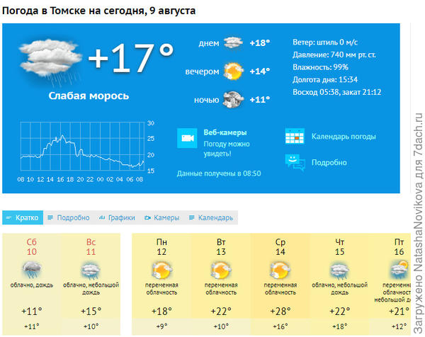 «Сегодня погода сохранится солнечной и жаркой, но на выходных под воздействием охотоморского гребня температура значительно понизится. В субботу, 9 августа, обойдется без осадков, задует свежий юго-восточный ветер. Температура ночью+19…+21 °С, днем +21…+24 °С. В воскресенье, 10 августа, в утренние часы возможна слабая морось, усилится юго-восточный ветер, температура станет еще на 1 — 2 градуса ниже субботней».
