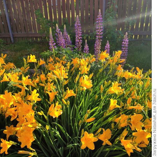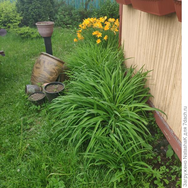 Так рядом куст желтого лилейника, с другой стороны еще два лилейника — все цветут как миленькие. Только вот эти четыре не цветут, одна листва — самые красивые!