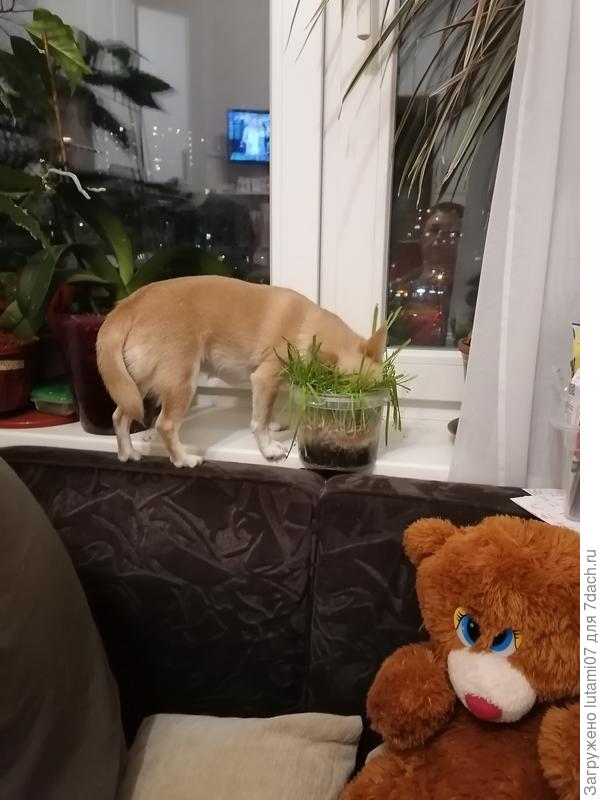 , это его натура. А вот овёс, посаженный дома, в этот раз не очень то ел. Больше собака лакомилась. Причём она выбирала именно зерна.