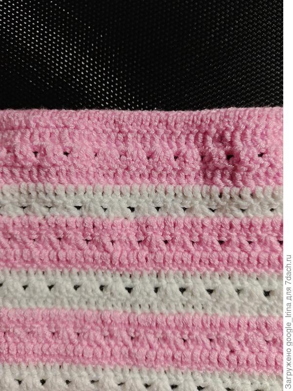 У меня пряжа была толще, чем на показанном образце, поэтому и количество петель и количество рядов получилось меньше — быстрее связала!
