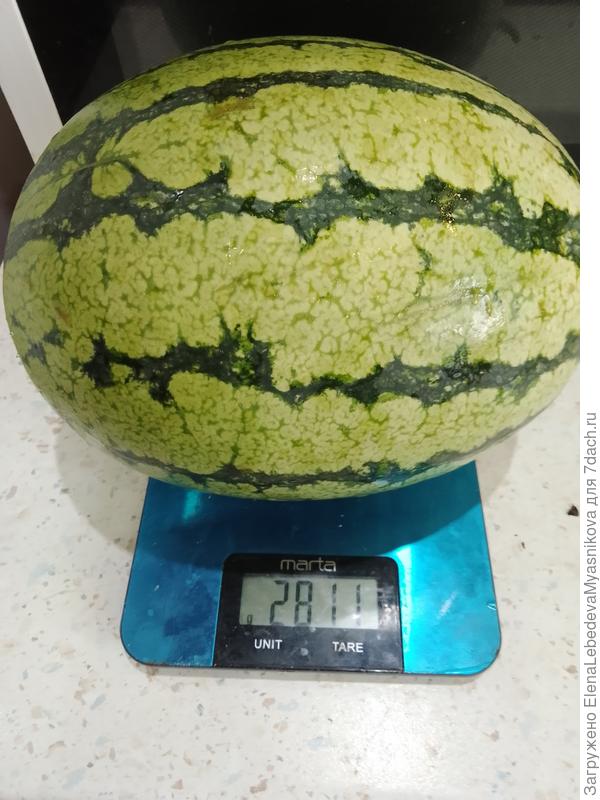 В субботу приехали внуки и решила сорвать арбуз, завязавшийся 10 июня.Арбуз оказался созревшим и сладким.