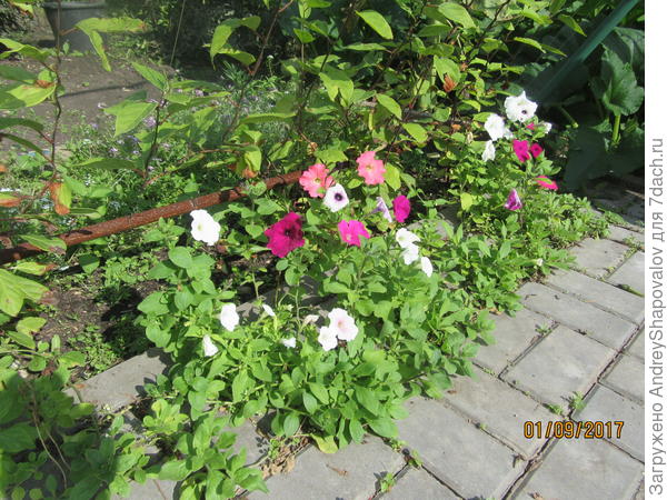 Самосев петунии повсюду, особенно много в вазонах с прошлогодним грунтом из под петунии, полоть приходится в тичении всего лета. На фото — самосев петунии в тротуарной плитке