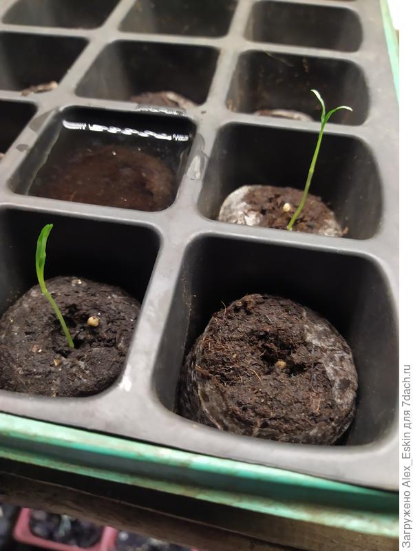 Посев 15 февраля в небольшие луночки. Обильно смочила семяна в лунке сначала горячей водой из пипетки, потом Перекисью водорода (по 2-3 капли). Затем снова пролила семена водой из пипетки и присыпала увлажненным грунтом из брикета. Кусочками зубочистки пометила расположение семян. Слила из нижнего лотка излишки воды. Закрыла «родной» крышкой верхний лоток и поставила в теплое место (+26-28).