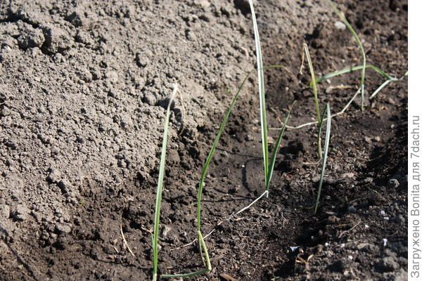 ![Вот так выглядит грядка после высадки рассады лука-порея. Видно, что перышки не обрезаны.]()