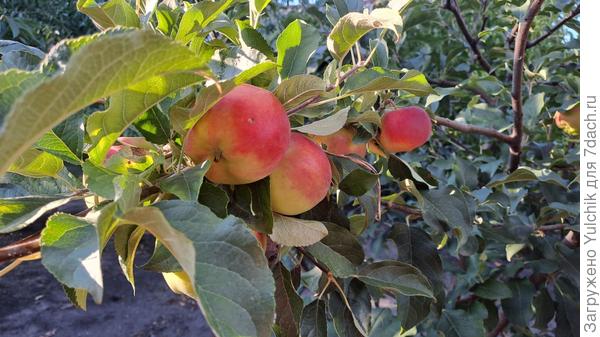 В этом году много яблок, подпирали каждую веточку, сейчас яблонькам уже полегче — уже много плодов сняли.