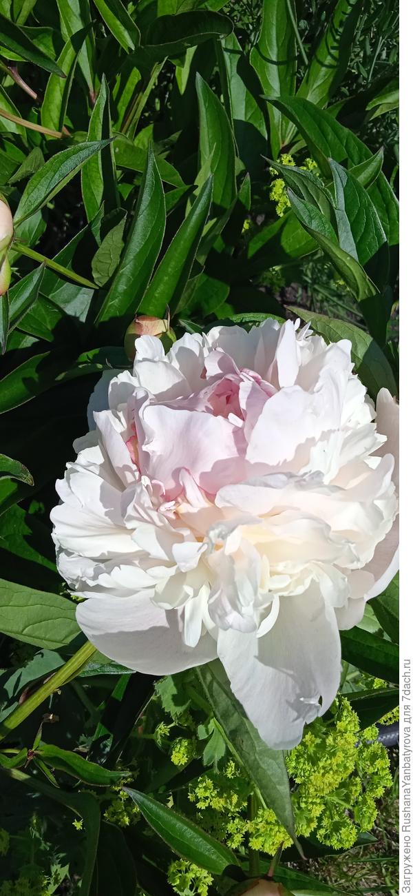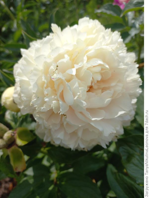 Также первым цветением просто влюбил в себя сорт 'Greenland' ('Гринленд', Pehrson, 1989, США). Цветки белые, непрозрачные. Но просто назвать этот пион белым было бы неправильно… Есть в нём и благородный бежевый оттенок. Также отличительная особенность сорта — зеленый подтон у основания лепестков в бутоне. Лепестки немного волнистые.