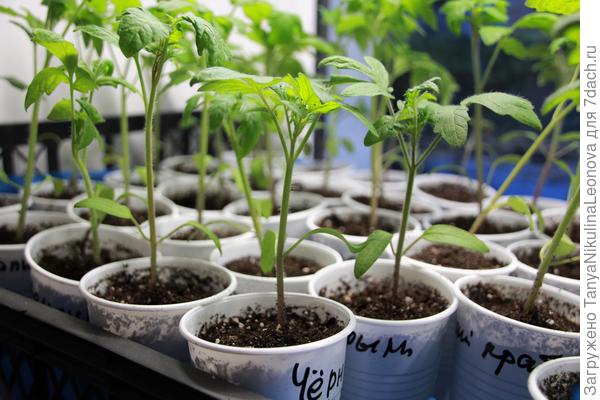 Как и все индетерминантные сорта, томат 'Чёрный Крым' высеваю на рассаду в конце февраля — в начале марта. В этом году посеяла 28 февраля.Сначала провела обеззараживание семян. Семена в тканевом мешочке опустила в раствор марганцовки на 20 минут, а затем промыла чистой водой. После этого замочила мешочек в растворе «Эпина» на несколько часов. Раствор слила, увлажнила чистой водой и семена сутки провели в тепле, около батареи отопления. Далее семена прошли закалку в холодильнике 2 суток, а потом посажены в ящик с землёй «Терра Вита» c добавлением вермикулита. Ящик обычно накрываю плёнкой, ставлю поближе к батарее. После появления всходов переношу на подоконник. Подросшую рассаду распикировала по отдельным горшочкам.