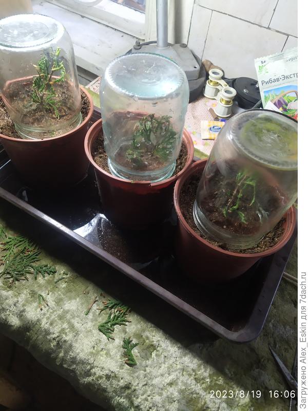 Но, во-первых, стеклянные банки сейчас все уходят на заготовки. Пластиковые закончились (я одних только роз 33 сорта начеренковала). Пробую сейчас можжевельники вообще без всего.