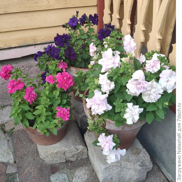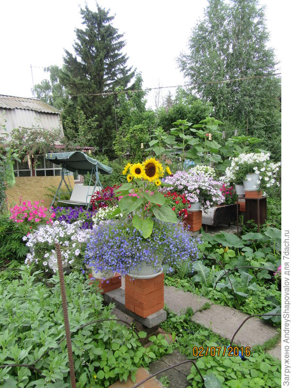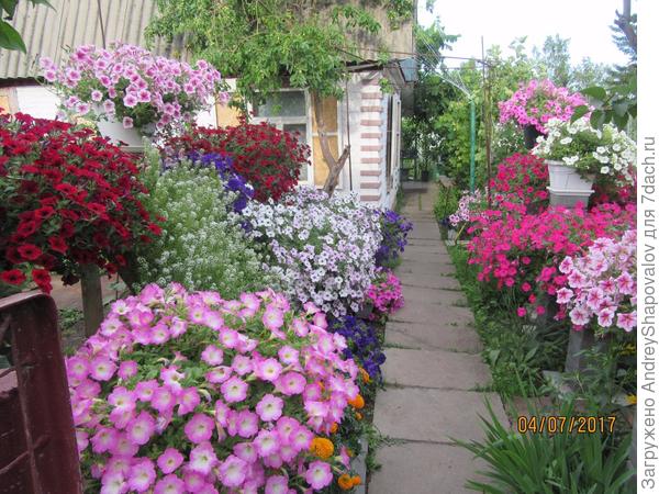 У Андрея великолепные цветы, много сил он отдает им. Однако с моей стремительностью такая расстановка цветов неудобна. Лоб был разбит, а колонны снесены, поэтому любимые герани красуются на заборе, на стенах дома. Каждый приспосабливается и творит для себя.