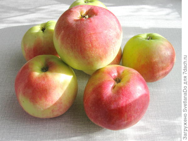 Вот такие яблоки у этого сорта. Летний. Вкус кисло-сладкий. Очень ароматные. Может, кто узнает?