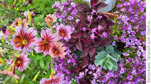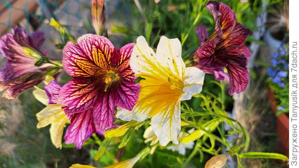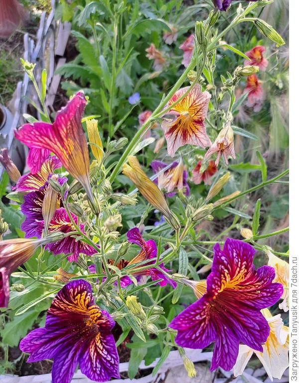 Все лето 'Долли' будет радовать нас фантастическими цветками. Конечно, надо поливать по мере просыхания грунта теплой водой. Потом аккуратно прорыхлить и замульчировать почву. У меня в качестве мульчи — скошенная трава. Но надо помнить, что сальпиглоссис не любит замокания, засуху и заморозки. А подкармливать достаточно 1 раз в месяц любым комплексным удобрением для цветов. При условии первоначальной хорошей заправки почвы. А еще меня порадовало то, что сальпиглоссис ничем не болел и вредители на него не покушались. Поэтому никаких обработок не требовалось.Кого же выбрать в компаньоны «райским птицам»? Ведь заранее не угадаешь, какой расцветки они будут из смеси. Поэтому подойдет классика — белый цвет. Например, на фоне тысячелистника 'Жемчужница' сальпиглоссис будет очень выгодно смотреться. А у меня в прошлом году получилось удачное сочетание с колеусом и лобелией.