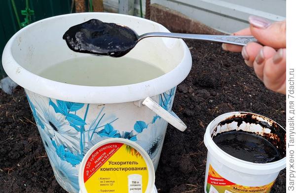 А еще там написано, что надо 1-2 столовые ложки этой коричневой пасты растворить в 10 литрах воды и пролить 1,5 куба компоста. И тогда органические отходы превратятся в ценный перегной за рекордно короткий срок!