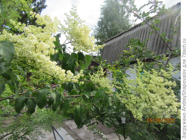 У меня кустик еще молоденький. Поэтому буду показывать вам в основном не весь куст, а отдельные соцветия. Так, мне кажется, красивее 🙂. Но могу дать описание как 'Красная Москва' будет выглядеть в возрасте. Высотой куст должен вырасти 2-2,5 м, при этом диаметр его будет 2 м. Иногда встречается информация, что высота куста достигает 4 м. Проверим.😉 Побеги прочные, густо разветвленные и направлены вверх. Длина соцветий — плотных крупных метелок — около 20 см.