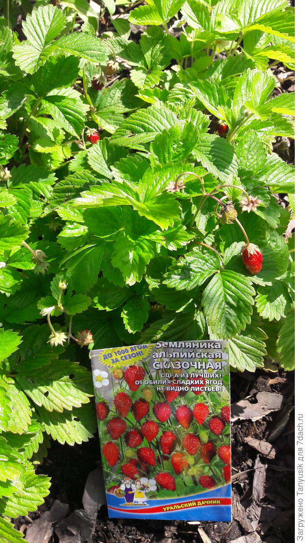 Третий год земляничке пошел. Она не дает усов, зато отлично размножается самосевом. Упадет ягодка на землю, а на следующий год на этом месте вырастают новые кустики земляники 'Сказочная'.