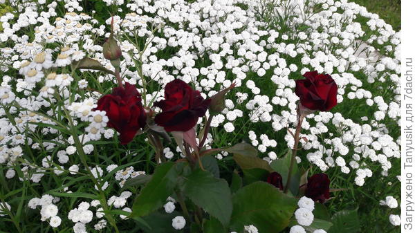 ✅ Хорошо сочетается с другими цветами. У меня 'Жемчужина' посажена вокруг роз. Считаю это очень красивым сочетанием. На белом жемчуге любые цветы будут очень выигрышно смотреться!