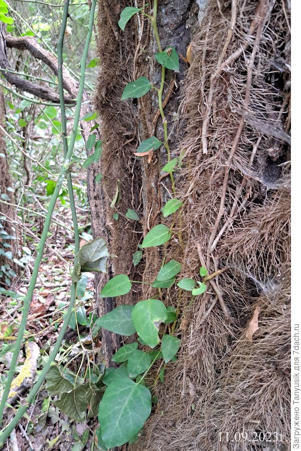 Еще здесь растет плющ Пастухова (занесен в Красную книгу), дикий виноград и клематис виноградолистный. По такому бревну трудно перейти на другой берег реки