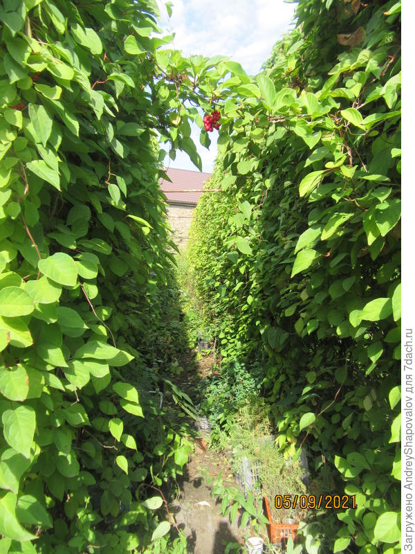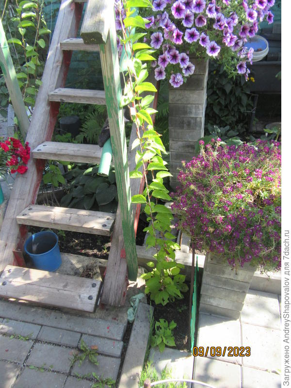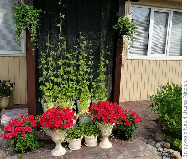 В прошлом году в качестве завесы сажала бешеный огурец. Он тоже может быть надоедой. А ещё его минус в том, что вырастает он скорее к августу, а солнце на крыльце доставляет неудобства уже в июне.