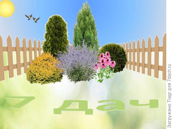 На создание проекта данной клумбы меня вдохновили советы наших Семидачников. Я вспомнила, что у меня в саду есть одно не обустроенное местечко – угол забора, где я планировала посадить можжевельники. А почему бы не добавить солнышка к тёмным можжевельникам в виде лапчатки, которая оживит золотистыми цветочками стройные пирамиды хвойных кустарников и добавит их элегантности немного озорства? Добавила))) Теперь необходимо нарисовать кусочек колышущегося неба. Для этой цели, как нельзя лучше, на мой взгляд, подойдёт красавица перовския. Её синеющие колоски будто растворяются в серебристом облаке листвы. Солнце всходит и озаряет своими лучами землю. Жёлтые, пурпурные, серебристые, голубые, розовые солнечные зайчики повсюду… Так я представляю себе эту клумбу.