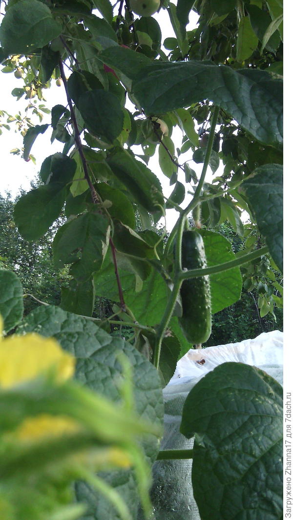 Огурец растёт в открытом грунте: под, на и над сосной, — словно ёлочка. Стишок о ёлочке, конечно же, — шутка, но огурец-то настоящий.