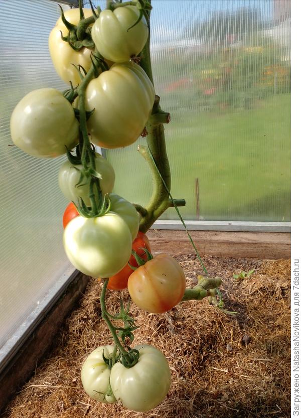Таких у меня два куста. Оба стоят обсыпанные плодами. Детерминантный, широкий куст. Пришлось обвязать, чтобы не разваливался.