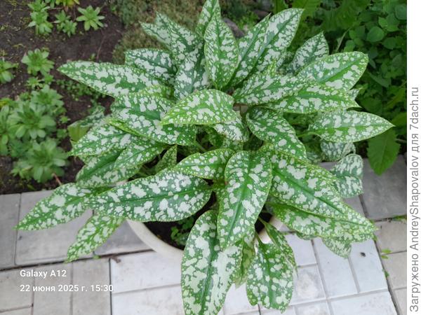 Декоративнолистный вечнозеленый многолетник высотой 30 см и шириной 60 см. Эллиптические листья длиной 27 см ценятся за эффектную серебристую пятнистость. Цветки сначала красно-фиолетовые, потом — фиолетовые или белые.