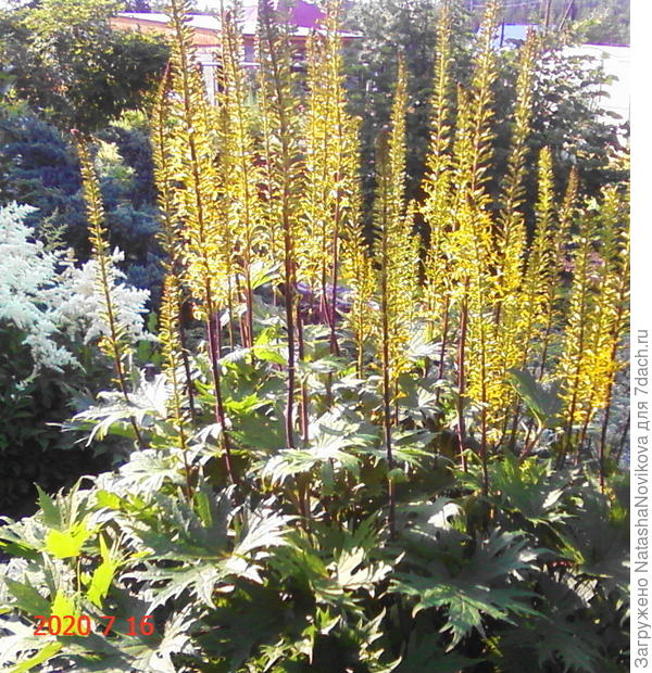 Это крупный многолетник высотой до 2 м и шириной до 1 м, образующий плотные заросли. Листья длиной до 30 см, фигурные, привлекают еще и необычной окраской: с середины лета на них проявляются коричневые разводы, увеличивающиеся до поздней осени. Цветет в середине лета. Ярко-желтые колосовидные или метельчатые соцветия на прочных цветоносах приподнимаются над мощной розеткой из крупных листьев на длинных черешках.