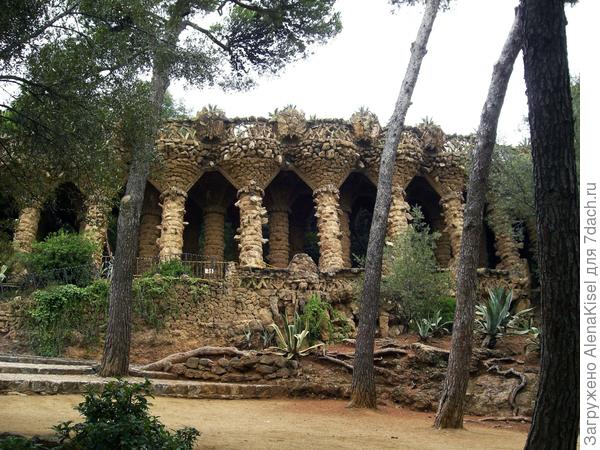 Последнее, что успел сделать Гауди в парке, проложить хитроумную систему дорожек и возвести несколько причудливых каменных аркад, столбы которых наклонены к холму под самыми невероятными углами, скрученные и изогнутые — они выполняют и утилитарные задачи: подпирают крутой холм, служат подставкой под вазоны с растениями, держат крыши галерей.
