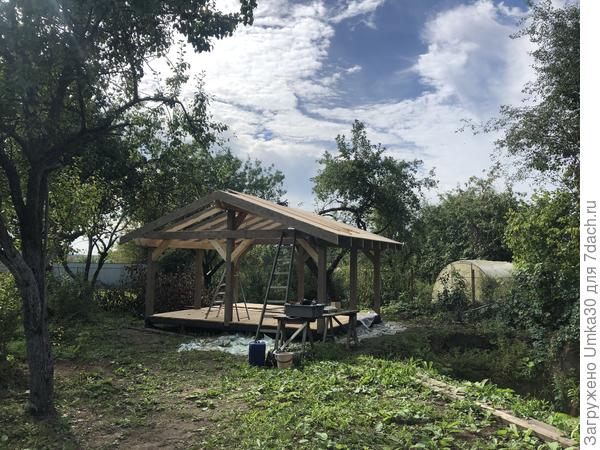 Продвигаемся мы не быстро, но видим цель. В этом году соорудили беседку. Может чуть сдвинули относительно сторон, но расположили повернутой под углом от забора и в том ± месте расположения на участке.