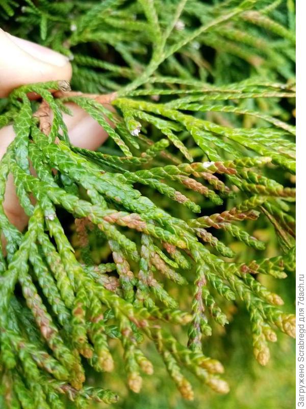 Туи купила в прошлом году, росли в горшках. В этом году посадила в землю (опад с леса, тырса, торф, земля). Не могу понять, что с кончиками веточек — сохнут. Поливала «Гетероауксином», «Мастер агро» для хвойных, опрыскивала «Эпином», «Сальто»,...