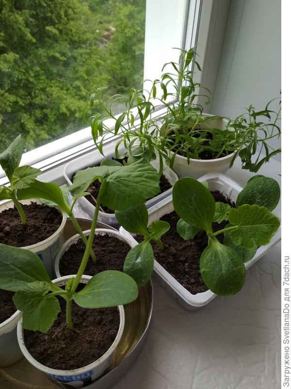 Пока я дожидалась всех всходов, на растениях огурца Пучковое очарование начали появляться настоящие листочки, несмотря на похолодание на улице. Посевы были по два семечка в лунку.