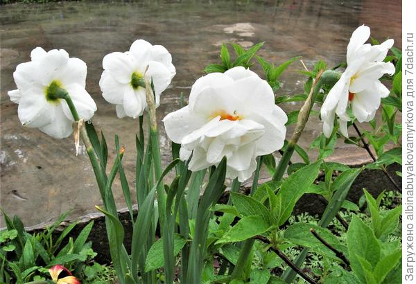 Среди махровых нарциссов привлекают внимание и высокорослый жёлтый сорт ‘Clear Day’ с оранжево-розовой махровой серединкой, и крупноцветковый сорт ‘Acropolis’. Он, если можно так выразиться, густомахровый и практически совсем белоснежный с небольшой оранжевой «опушкой».