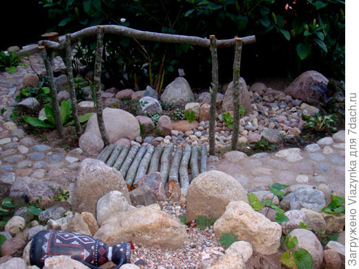 Зона отдыха в моем саду «Зелёная комната». Именно в этой комнате находится «сухой ручей» и небольшая альпийская горка. С вершины горки из разбитого кувшина «вытекает» сухой ручей, который позже впадает в маленький живой водоем, в котором охотно поселилась семья больших красивых жаб.