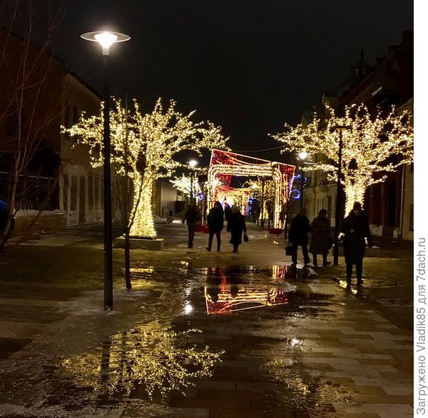 Здания на противоположной стороне улицы тоже красиво подсвечены...