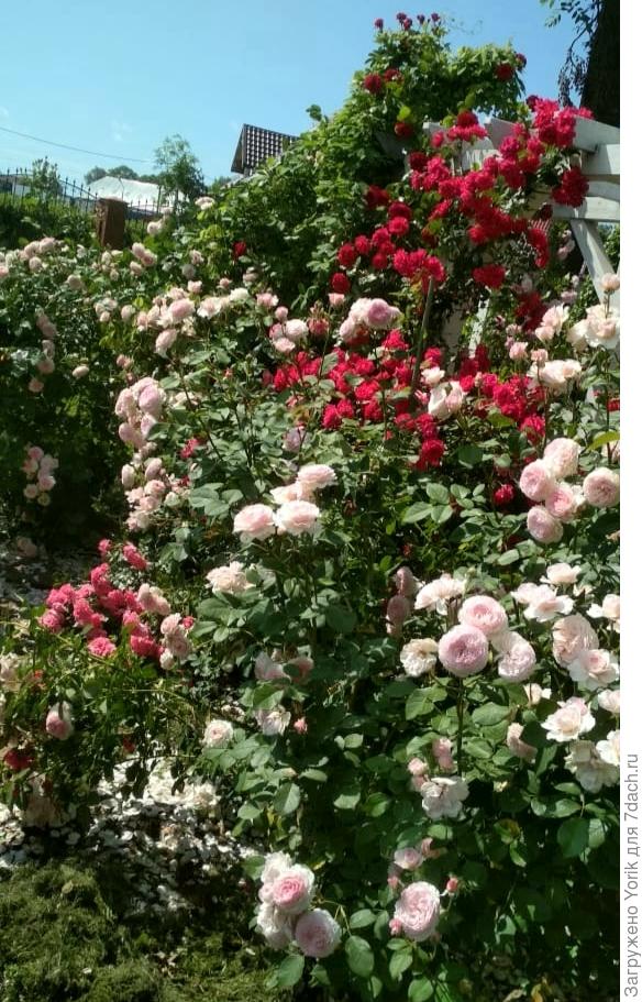А я с клематисом промахнулась. Мне он нравится, но зацветает поздновато. Пока он еще вскарабкается по арке, а потом только зацветет… Да еще цветет на самом верху. Хочешь полюбоваться — взлетай птичкой и любуйся на него