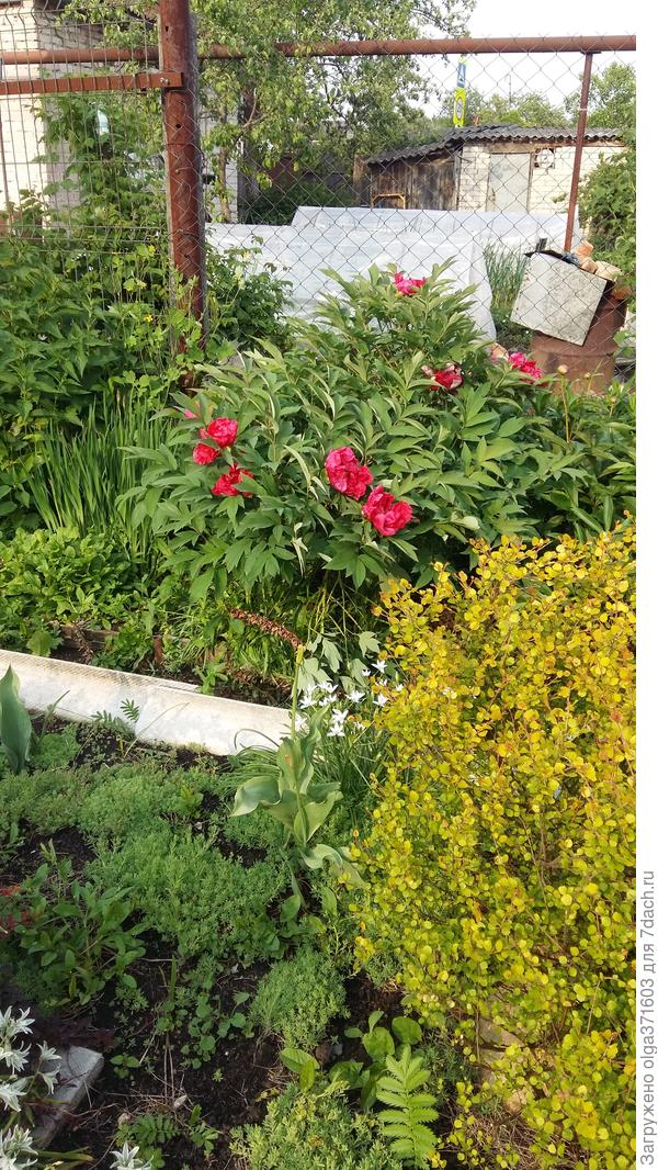 Розы еще только в бутонах, так что соперников нет. И тис радует молодой хвоей.