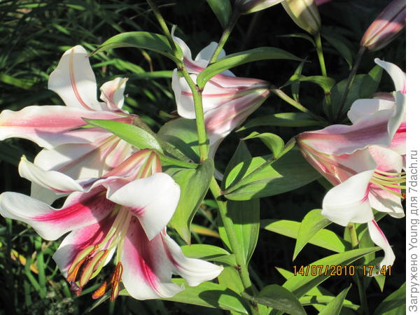 На 100% я правда не уверена, но белые, что на фото выше, ж\ вроде ОТ-гибрид Притти Вумен. Когда они мои первогодочки начинали цвести (на трёх лилиях было 26 бутонов), то на несколько метров от них доносился очень нежный и приятный запах, напоминающий аромат французских духов. Размер цветков меня тоже удивил, больше ладони.