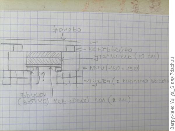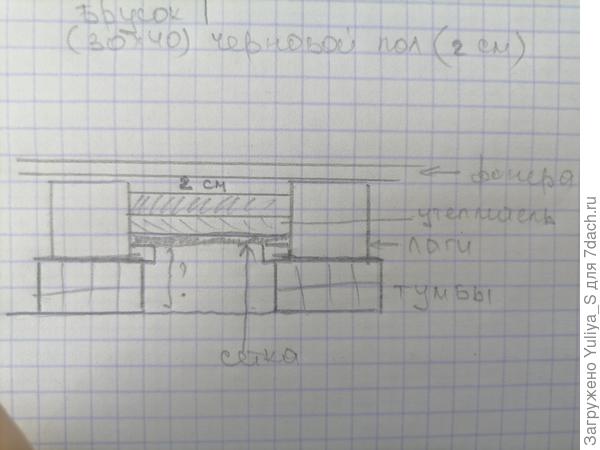 Изначально планировали так. Только не определились куда сетку. Утеплитель по высоте получился вровень с лагами. Так как брусок 3см, доска чернового пола 2см, утеплитель 10см. Итого 15 смотри, как раз высота лаги. Я предлагала набить на лагу контррейку и на нее покрытие из фанеры, например. Для того чтобы сделать воздушный зазор. У меня был вопрос по поводу расстояния от грунта до чернового пола (на схеме знак вопроса). Но строители предложили не ложить черновой пол, на бруски набить сетку. Тогда получится зазор в 2 см. На втором фото вариант без чернового пола. Опять же вопрос о расстоянии от грунта до сетки остается открытым. Схемы рисовать не умею. Извините заранее!