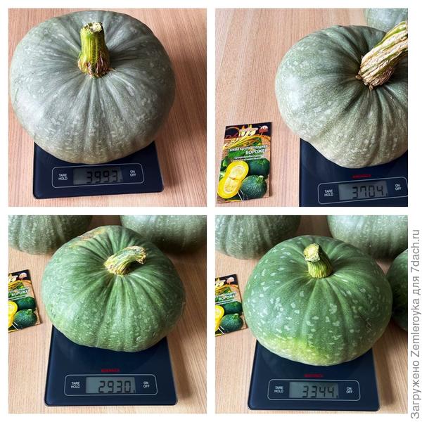 «Плоды плоскоокруглые, зелёного цвета, массой 3,5-5,0 кг». Всё верно. Я бы сказала, что те тыквы, который завязались первыми, имеют зелёный цвет с серым налётом. Средний вес тыквы составил 3492 грамма. Самая большая весила 3993 грамма, самая маленькая — 2930 граммов.