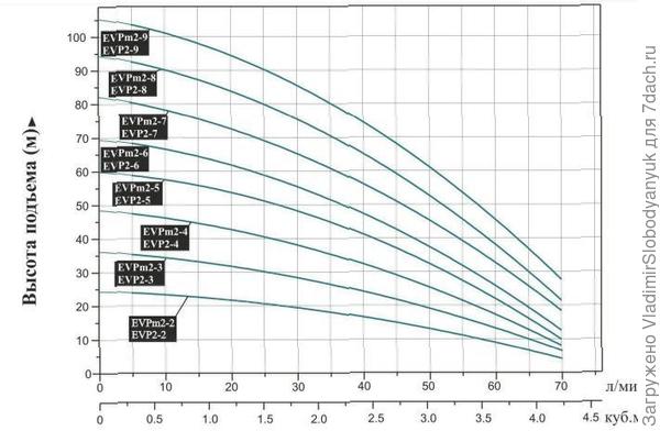 данное отношение влияет множество факторов). Таким образом, вам надо поднять воду на высоту 90 м + 95 м =185 метров. Очень хорошо, что вы прислали графики расходно-напорных характеристик. Так как вы решили приобретать насос мощностью 2, 2 кВт, то ваш график — №4. При подъеме на 185 условных метров он сможет обеспечить чуть больше 1 кубического метра в час.