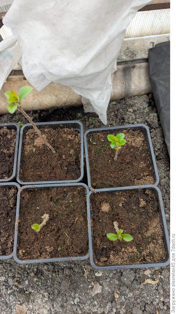 Предварительный итог после всех мытарств: из восьми приобретенных саженцев два, более или менее соответствующие заявленным, выдвинули белые корешки.