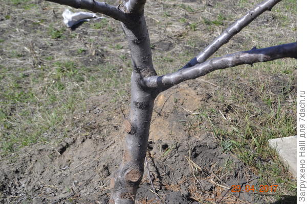 Осенняя побелка с молодых деревьев смыта зимними осадками, и от нее остались только небольшие пятна в углублениях сучков. На деревьях постарше, кора которых в нижней части ствола бугристая, побелка, конечно, держится лучше, но тоже местами сильно облезла. Так что пора приниматься за труды.