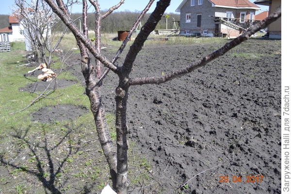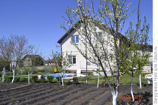 Одно радует — на старых деревьях осталась ещё акриловая краска и их белить не надо, а новое дерево находится в это время в тени дома и не перегревается ещё.