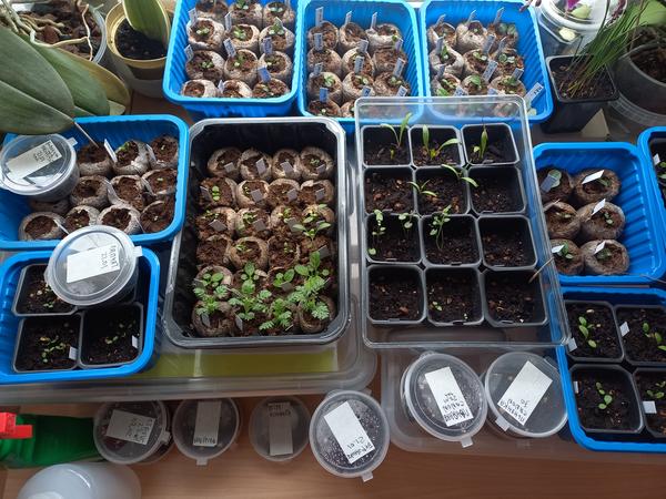 В соусниках немного влажной земли и посеяны семена, ждут своей очереди, длительная стратификация: две недели тепло, потом около месяца-двух в холоде, в конце февраля уже доставать