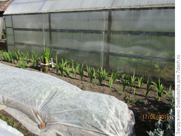 Для гладиолусов делаю траншею см 15 — 20, на дно сыплю песочек, и ещё луковицы вдавливаю с разумным усилием. Первый раз засыпаю см на 5, а потом уже по мере отрастания листьев.