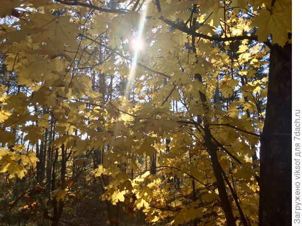 Обычно мой любимец клён в октябре уже с красными листьями, нынче все только золотые, но солнышко так их подсвечивает