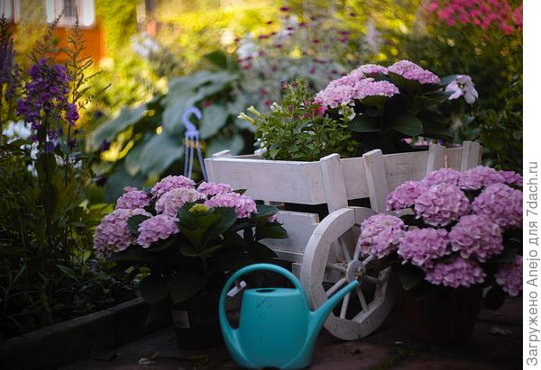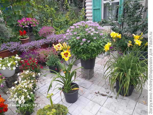 У меня вазоны натыканы везде. на пошаговой дорожке. Решила, что так проще полив организовать. Когда была жарища и я не знала. насколько земля пролилась как следует — просто ставила их в тазы с водой, отходили за пару часов.